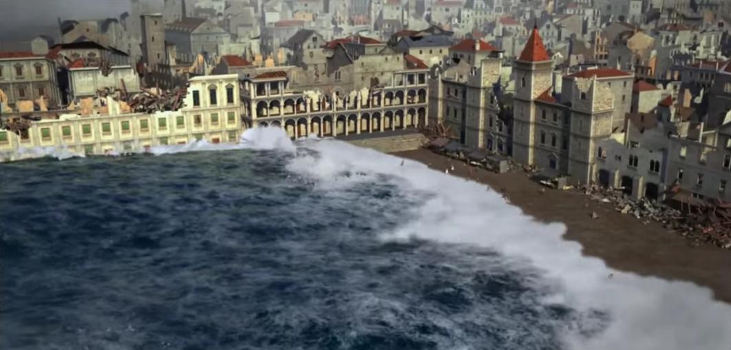 Uma hora e meia depois chegou o tsunami, gerado pela deformação no fundo do mar quando se deu o sismo, e inundou a zona ribeirinha da capital. Por último, os incêndios. Os fogões no casario denso, sempre acesos, atearam fogos que cobriram Lisboa de negro.