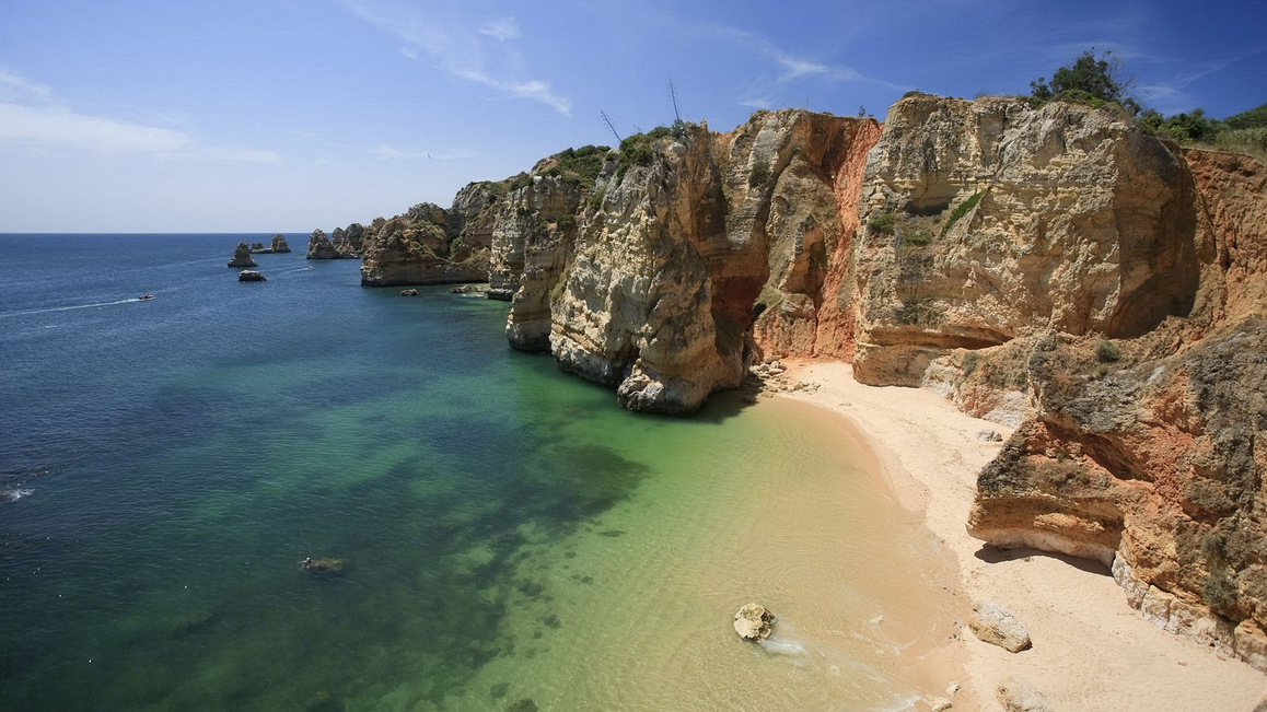 Abrigado entre falésias, o areal da Praia de Dona Ana banhado por um mar de águas límpidas e tranquilas é uma das imagens mais divulgadas das praias do Algarve. As rochas muito recortadas que emergem do mar ou que se espalham pelo areal proporcionam algumas sombras aos veraneantes e dão um toque pitoresco à paisagem.